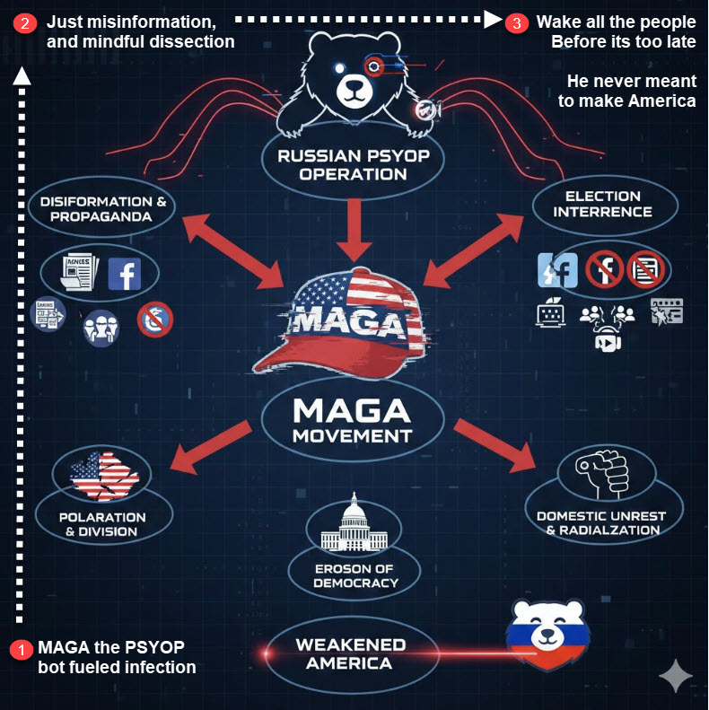 MAGA the psyop bot fueled infection, just misinformation, and mindful dissection Wake all the people Before its too late He never meant to make America Great