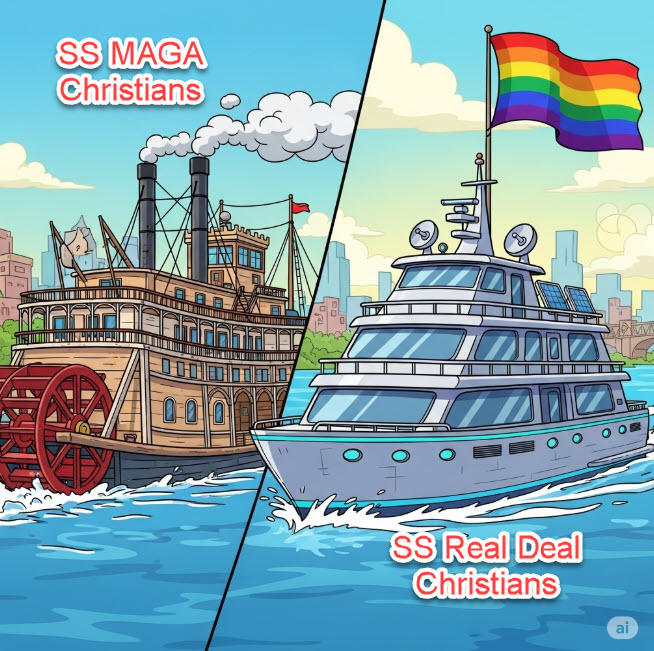 Imagine two river boats (the SS MAGA for Christ and the SS Real Deal Christians) drifting down a wide river. The passengers on both boats refer to themselves as Christian, both rely on the same map for navigation — the Bible — but they interpret the terrain and the currents very differently.