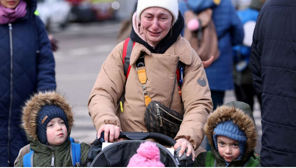 Stoyan Nenov/Reuters A woman cries as she walks with her children after fleeing from Russia’s invasion of Ukraine, at the border crossing in Siret, Romania, Feb. 28, 2022.